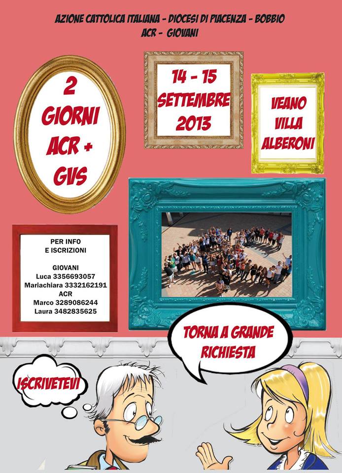 Ultimissimi giorni per iscriversi! L’anno scorso eravamo in tanti, quest’anno vorremmo essere ancora di più! Il 14 e 15 settembre ci sarà, per i ragazzi dell’ACR e per i Giovanissimi delle superiori, la possiblità...