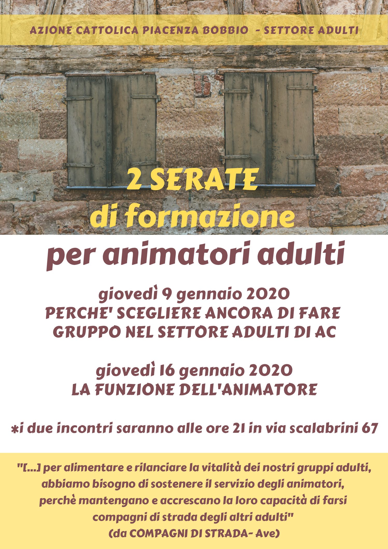 GIOVEDì 9 e 16 GENNAIO 2020  ore 21/22.30 presso il Centro Diocesano di Azione Cattolica, Via Scalabrini 67 – Piacenza Il Settore Adulti dell’Azione Cattolica Diocesana propone due serate di formazione per animatori dei...
