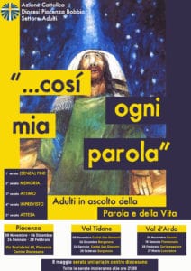 Per questo abbiamo deciso di farci in “tre”: partiranno infatti tre itinerari in tre zone della nostra diocesi: uno in città, uno in Val Tidone e uno in Val d’Arda. Ogni zona realizzerà quattro serate scegliendo in quale/quali parrocchie dare appuntamento per poi confluire tutti in un’unica serata unitaria venerdì 8 di maggio a Piacenza (luogo da definire).