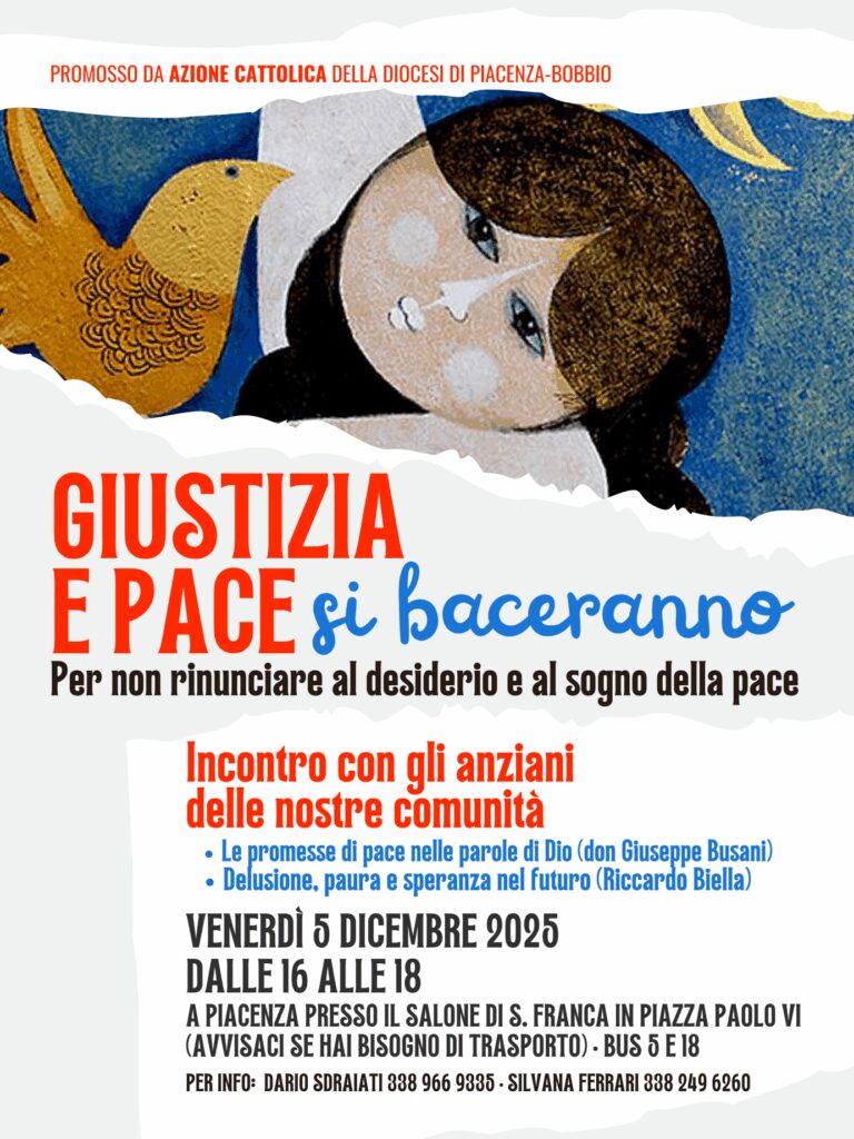 E’ in questo spirito che l’Azione Cattolica Diocesana propone l’incontro per gli anziani delle nostre comunità sul tema “GIUSTIZIA E PACE SI BACERANNO” il giorno 5 dicembre, dalle 16 alle 18, presso il salone della parrocchia di S. Franca, P.za Paolo VI.