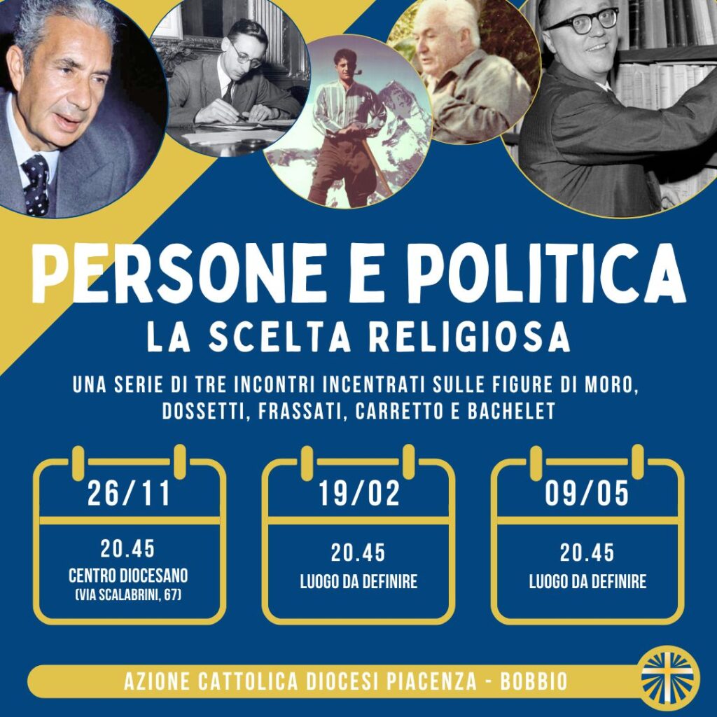 Mercoledì 26 Novembre, nell’Aula Magna del Seminario Vescovile di via Scalabrini (Piacenza), si svolgerà il primo incontro del percorso “Persone e Politica – La Scelta Religiosa”, promosso dalla commissione socio-politica di Azione Cattolica, in collaborazione con Caritas e Rete di Trieste.