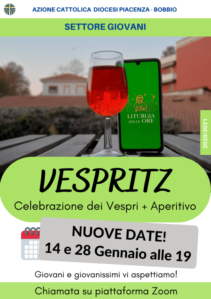 Accogliendo l’invito del nostro Vescovo durante l’ultimo appuntamento nel tempo di Avvento, il Settore Giovani rilancia la proposta del Vespritz anche per i prossimi mesi.